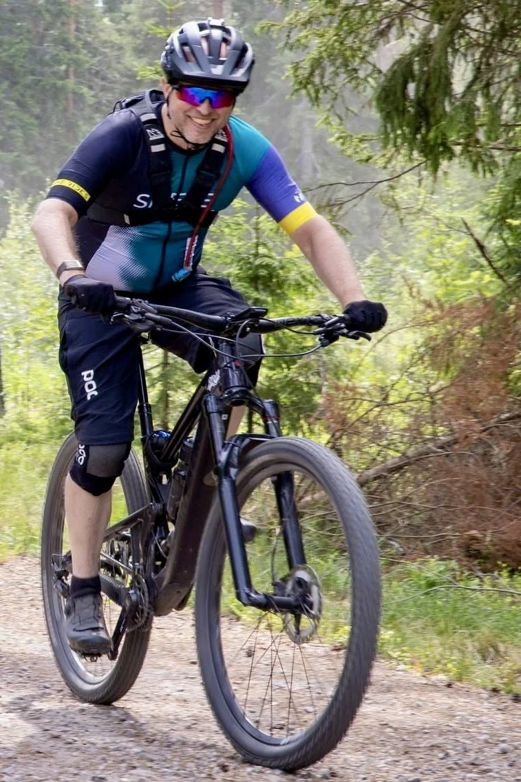 Är 48 år, bor i Stockholm och älskar att cykla i alla former – oavsett om det handlar om landsväg, XC eller långa distanspass i skogen.